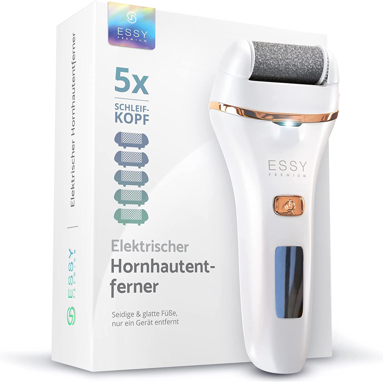 EFFIZIENTE PEDIKÜRE FUßPFLEGE: Erhalten Sie eine starke und effiziente Pediküre Fußpflege, die Ihnen hilft, seidige und glatte Füße zu erhalten, ohne den manuellen Hornhauthobel zu benutzen. Beenden Sie das Geldverschwenden für Fußpflegegeräte-Termine und behandeln Sie Ihre Füße mit einer professionellen Prozedur - jederzeit und überall. Essy Premium Hornhauthobel elektrisch bietet Ihnen 3 verschiedene Walzen, die wiederaufladbar sind, um Ihren Bedürfnissen gerecht zu werden! EINFACHE EIN-KNOPF-BEDIENUNG: Der Essy Premium Elektronische Fußfeile-Hornhautentferner ist sehr benutzerfreundlich, da er mit nur einem einzigen Knopf bedient wird. Schalten Sie das Gerät ein, ändern Sie die Schleifgeschwindigkeit von 1 auf 2 und schalten Sie es durch Drücken der Betriebstaste aus. Mit diesem Pediküre-Gerät Hornhautraspel elektrisch sind Sie auf dem Weg zu schönen Füßen. Es ist Ihr einfach zu bedienendes elektrischer Hornhautentferner Füße für harte Haut! BENUTZERORIENTIERTE FUNKTIONEN: Dieses ergonomische Mehrzweckgerät ist auch in der Lage, Ihre Bedürfnisse zu erfüllen. Es hat 2 einstellbare Schleifgeschwindigkeiten, Licht und bequeme USB-Aufladung. Der sanfte Fuß Hornhautentferner hat auch eine wasserfeste Konstruktion, sodass Sie ihn überall hin mitnehmen können. Darüber hinaus werden 5 Ersatzrollen mitgeliefert, um die Lebensdauer des Geräts zu verlängern.