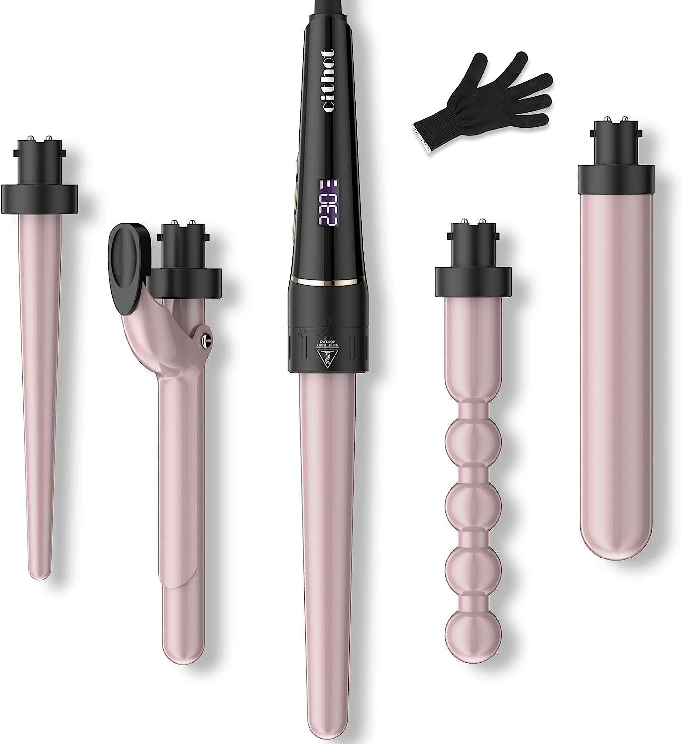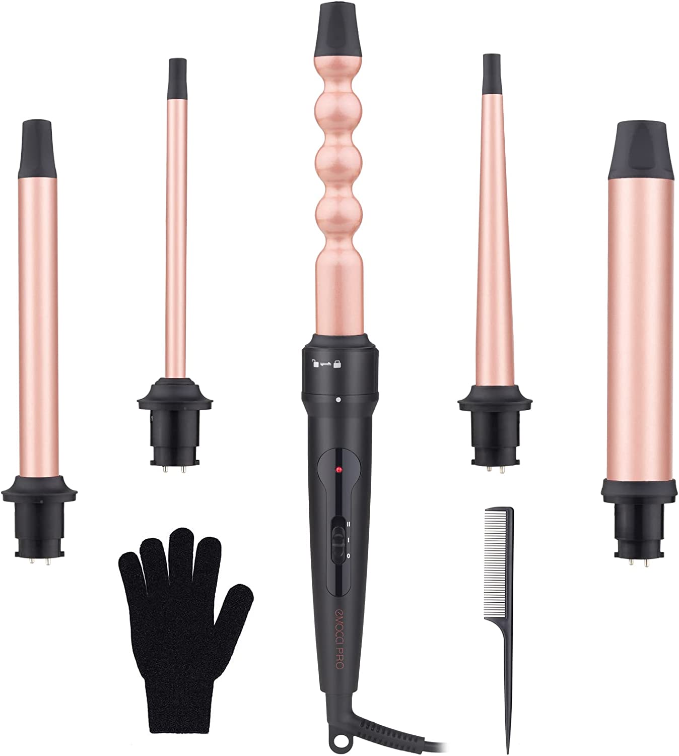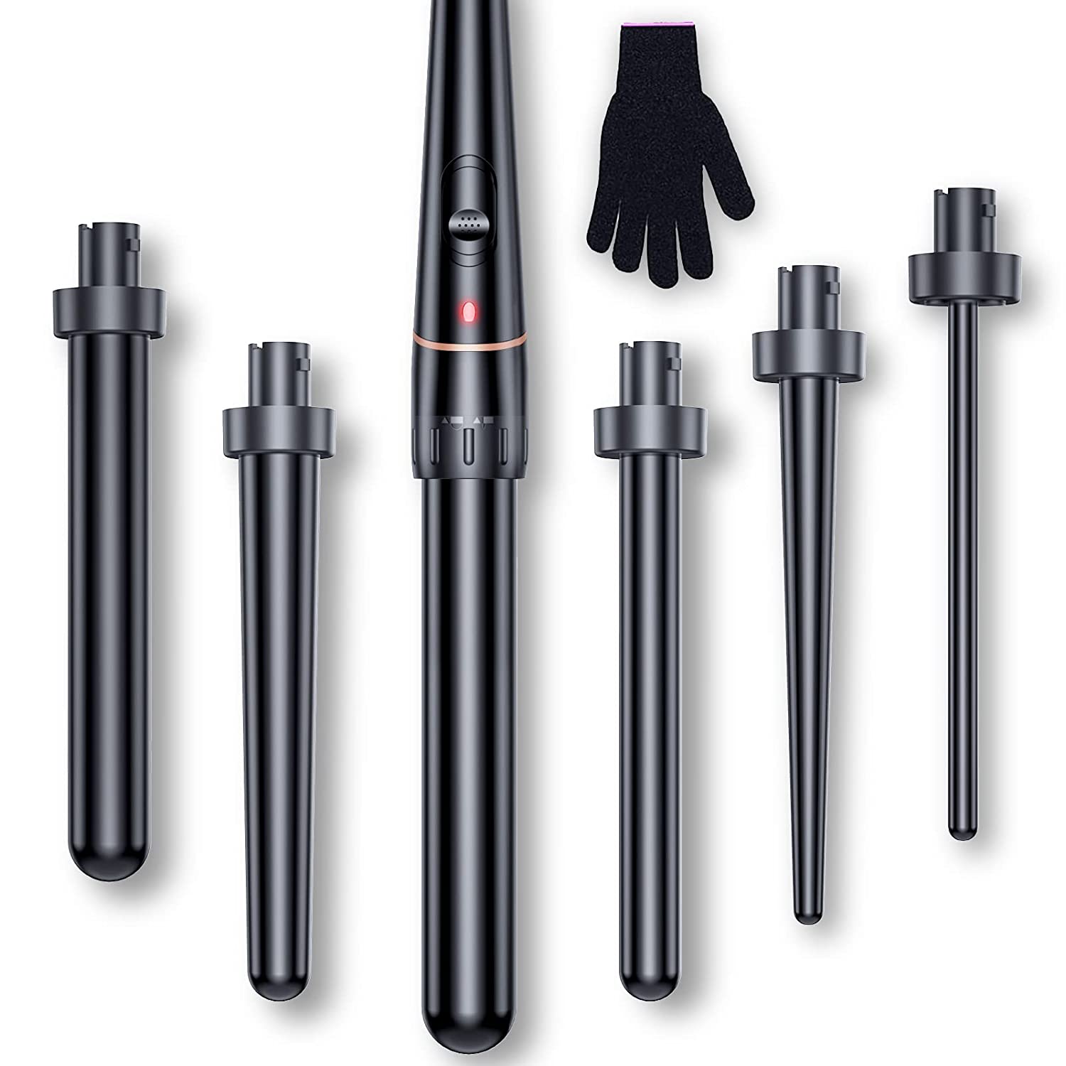 Achtung: Drücken Sie die ON/OFF-Taste 3 Sekunden lang, um das Gerät einzuschalten. LCD-Anzeige und temperaturregelbar: LCD-Display mit digitaler Temperatureinstellung, von 80°C bis 230°C. 5 austauschbare Aufsätze: Das Gerät wird mit nicht weniger als 5 verschiedenen Rollen mit unterschiedlichen Durchmessern geliefert, um verschiedene Lockenstile zu erzeugen. Turmalin und Keramik-Technologie: Der Lockenstab verleiht Ihnen seidiges, glänzendes und gesundes Haar. Automatische Abschaltung: Wenn Sie vergessen, das Gerät auszuschalten, schaltet es sich nach 60 Minuten automatisch ab. Darüber hinaus wird das Lockenwickler Kit mit einem Paar Handschuhe geliefert, um Ihre Hände vor der Hitze zu schützen. Der Lockenstab 5 in 1 LCD Keramikbeschichtung Multifunktions Austauschbare Welleneisen mit Handschuhe Lockenwickler Kit bietet Ihnen eine einzigartige Erfahrung. Dank der LCD-Anzeige und der temperaturregelbaren Funktion können Sie die Temperatur auf Ihre Bedürfnisse anpassen und Ihre Haare schonend stylen. Mit 5 austauschbaren Aufsätzen können Sie verschiedene Lockenstile erzeugen. Außerdem wird Ihr Haar dank der Turmalin- und Keramik-Technologie seidig, glänzend und gesund bleiben. Dank der automatischen Abschaltung müssen Sie sich keine Sorgen machen, dass Sie das Gerät vergessen auszuschalten, denn es schaltet sich nach 60 Minuten automatisch aus. Zusätzlich wird das Lockenwickler Kit mit einem Paar Handschuhe geliefert, damit Sie Ihre Hände vor der Hitze schützen können. Dieses Kit is.
