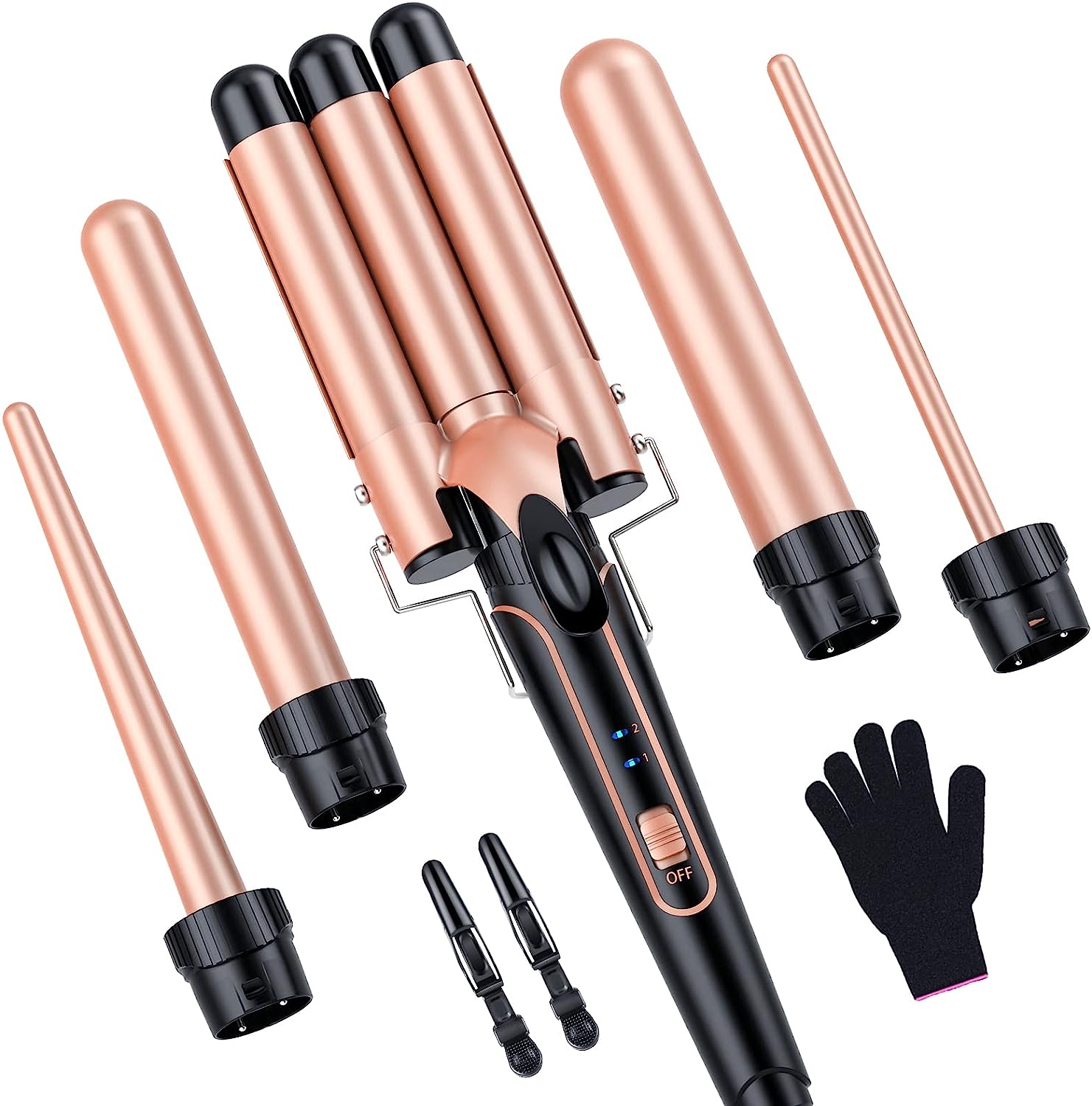 Dieser Lockenstab 5 in 1 Set Lockenwickler 09-32mm ist ein perfektes Werkzeug für Große und Kleine Locken. Erstellen Sie Ihren eigenen Stil mit 5 austauschbaren Aufsätzen - 09-18mm, 19-25mm, 19mm,32mm,25mm Perle. Dieses Produkt hat ein elegantes Design in zurückhaltendem Roségold. Es wird in einer schönen Lockenstab Box geliefert, die ideal als Geschenk für Sie oder Ihre Liebsten ist. Die Beschichtung aus Keramik und Turmalin pflegt Ihr Haar und erwärmt es gleichmäßig für weichere, glänzendere Locken und weniger Hitzeschäden. Es verfügt über ein LCD-Display mit digitaler Temperaturanzeige, die von 80°C bis 230°C eingestellt werden kann. Zudem können Sie das Display durch gleichzeitiges Drücken der Tasten +/- von Grad Celsius auf Fahrenheit ändern. Der Lockenstab ist mit einer automatischen Abschaltung ausgestattet, die nach 60 Minuten aktiviert wird, um ein versehentliches Einschalten zu verhindern. Durch das 2,0m lange drehbare Netzkabel ist er einfach zu bedienen. Dieser Lockenstab 5 in 1 ist eine gute Wahl für alle, die ein stilvolles Design und einzigartige Locken wünschen. Es ist eine einmalige Investition, die Ihnen jahrelang Freude bereiten wird.