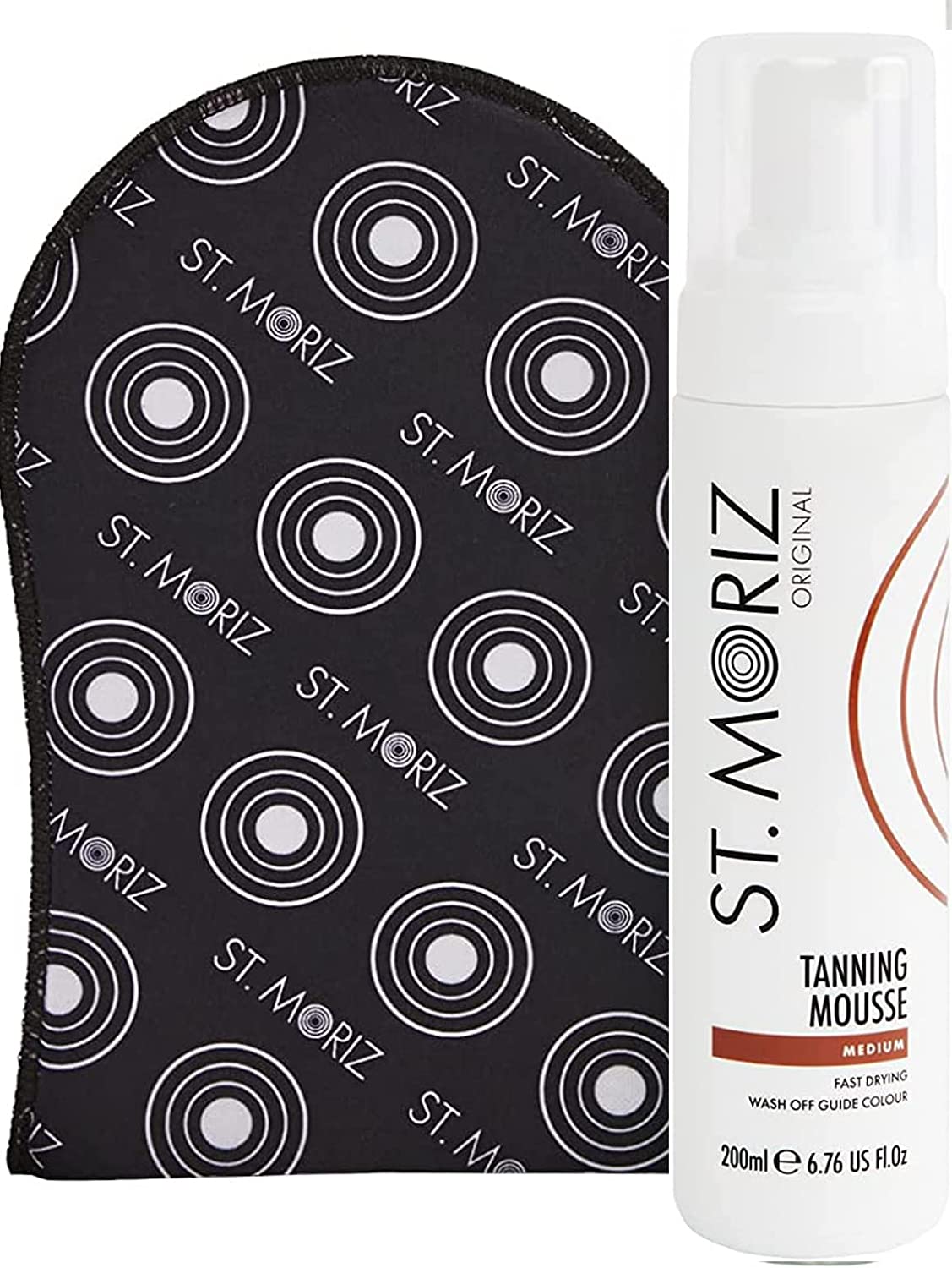 Diese selbstbräunende Mousse von St Moriz ist ein müheloses Erlebnis, das Ihnen eine professionelle Bräune ohne Unordnung bietet. Es ist sehr schnell trocknend und hinterlässt keine Schlieren. Der Pure Beauty Award Winner 2011/2012/2013 mit SolKiss 3-in-1 Selbstbräuner-Applikator ist ein einfaches Accessoire, das entwickelt wurde, um Selbst- oder Fake-Bräunungslotionen und Mousse gleichmäßiger aufzutragen, ohne Ihre Hände zu verschmutzen. Die weiße Schwammseite ist zum sanften Peeling der Haut und zum Auftragen des Selbstbräunungsprodukts geeignet, während die braune weiche Baumwollseite für ein streifenfreies Finish nach der Anwendung poliert. Das Set beinhaltet einen St Moriz Applikator-Handschuh, der ein einfaches Auftragen der Mousse ermöglicht. Der Handschuh lässt sich aufgrund seiner elastischen Bänder bequem am Handgelenk befestigen, so dass man die Hände frei hat, um die Mousse gleichmäßig zu verteilen. Zudem ermöglicht der Handschuh ein müheloses Abwaschen der Hände nach der Verwendung. Die Mousse enthält eine intensive Feuchtigkeitscreme, die die Haut während des Bräunungsprozesses nährt und schützt. Der Inhalt ist ausreichend für die Verwendung auf einer großen Körperfläche. Um ein optimales Ergebnis zu erzielen, sollten Sie die Mousse immer gleichmäßig und in kreisenden Bewegungen auftragen.